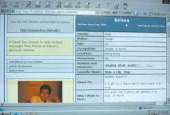 在這個名為“Friendster”的征友網站上,陳冠希用自己英文名“Edison”征友,在網上不僅有他詳細的資料,還有他6張生活照片,從照片的拍攝角度來看,應該是陳冠希用網絡攝像機自己拍攝的,一向搞怪的陳冠希在網絡世界也不愿放棄作秀機會,6張照片既有成熟穩重的模樣,也有扮猩猩、吐舌頭的怪相,甚至有陳冠希向網友送上香吻的照片,極為搞笑。