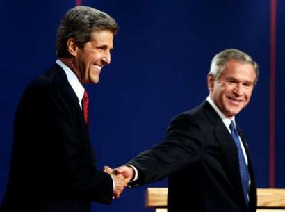 兩位候選人,一位是總統(tǒng),一位是參議員,皆出自富家名校,又都伶牙俐齒,在辯論場(chǎng)上也已身經(jīng)百戰(zhàn),不過(guò),布什作為在任總統(tǒng),又在民意調(diào)查中小占上風(fēng),加上在伊拉克戰(zhàn)爭(zhēng)上、尤其在反恐工作中得到許多選民認(rèn)可,他似乎只要在辯論中保持不敗即可站穩(wěn)腳跟。