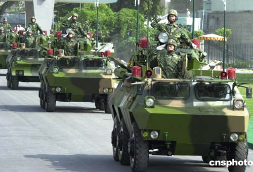 駐澳門部隊裝甲縱隊在接受澳門同胞的檢閱。作者:梁永強
