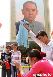 十月四日國慶假期,北京天安門廣場游人如織,在孫中山先生像前留念的人們更是多的要排隊等候,圖為兩名姑娘耐心等待正在拍照的三口之家先按動快門。中新社記者:鄒憲