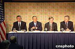 美國(guó)司法部長(zhǎng)阿什克羅夫特、商務(wù)部長(zhǎng)埃文斯、貿(mào)易代表佐立克、國(guó)土安全部副部長(zhǎng)哈欽森(從左到右),十月四日在華盛頓聯(lián)合宣布啟動(dòng)“瞄準(zhǔn)有組織侵權(quán)策略”行動(dòng),將采取更加嚴(yán)厲的措施打擊侵權(quán)盜版。埃文斯稱,知識(shí)產(chǎn)權(quán)保護(hù)狀況被美國(guó)列為其承認(rèn)中國(guó)市場(chǎng)經(jīng)濟(jì)地位需要討論的重要問(wèn)題之一。作者:余東暉