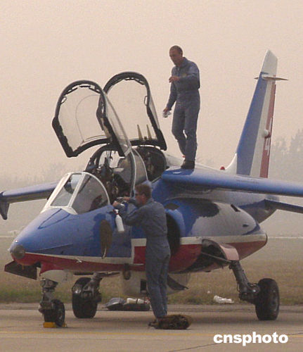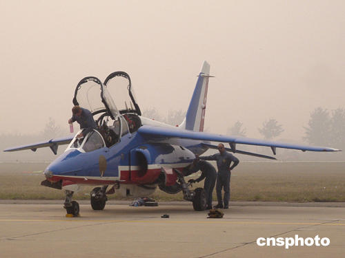 法國飛行員對飛機(jī)做認(rèn)真的清洗檢查。但飛行表演最終因天氣原因宣告取消。余瑞冬 攝