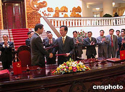 正在這里進行正式訪問的中國國務院總理溫家寶和越南總理潘文凱出席了簽字儀式。