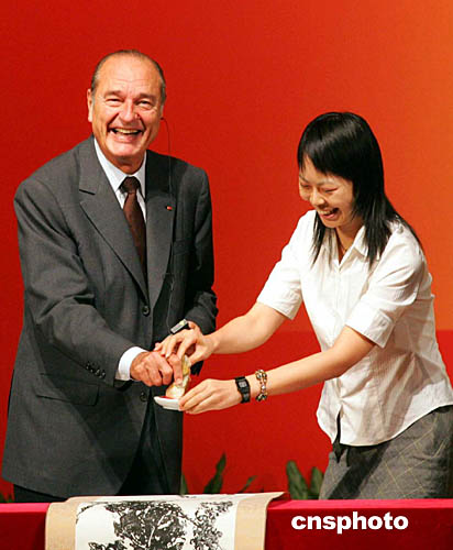 受中國國家主席胡錦濤的邀請,法國總統希拉克八日起對中國進行為期五天的國事訪問。在鄧小平的家鄉欣賞了絢爛的民族舞蹈、神奇的川劇變臉;在杜甫草堂與詩圣進行了跨越時空的交流;在北京與中國最高層領導人舉行了親切會晤,希拉克又在上海出席了中法中心的奠基儀式,并做了為時半個鐘頭的激情演講。