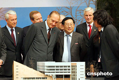 演講之前,希拉克出席了中法中心的奠基儀式。他一邊聽講解,一邊仔細觀看了即將破土動工的中法中心模型。他在演講中說,很高興能夠參觀中法科技創新中心的建筑模型,并稱之為中法合作精神的重要體現。