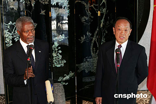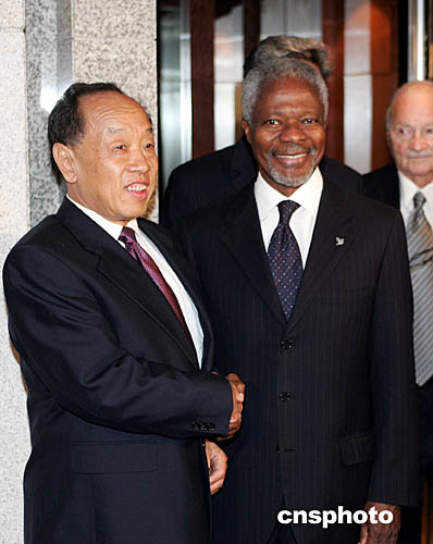 在一名美聯社記者問安南秘書長“有沒有向中國表示對中國人權記錄的關切”后,李肇星外長禮貌地請提問的記者走前一步,以便能聽清他的回答: