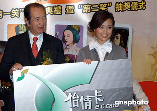 十月十二日,澳門博彩股份有限公司舉行蒙羅莉薩“笑三笑”百萬元抽獎活動第二次抽獎儀式,香港歌影視紅星容祖兒應邀擔任抽獎嘉賓,活動中澳博行政總裁何鴻燊向容祖兒贈送怡情卡。作者:梁永強