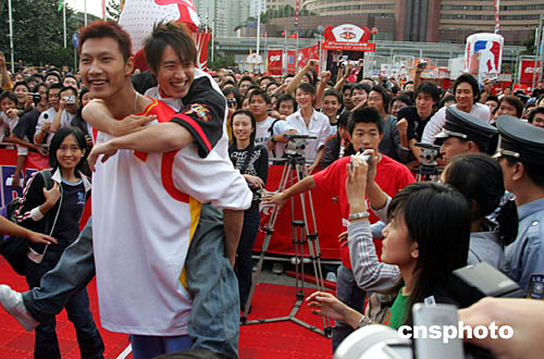 NBA中國大賽十月十四日即將在上海體育館舉行。十三日舉行的“可口可樂NBA嘉年華”出現火爆追星情形。可口可樂形象代言人潘瑋柏一見中國男籃隊球員易健聯便跳躍在其背上,引起上海追星族歡呼和現場混亂。作者:潘索菲