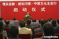 中新網10月14日電(記者 李淑國)情系首都·感知河南——“中原文化北京行”活動14日在北京啟動,這是河南省在首都北京舉辦的第一次大型綜合形象展示活動。