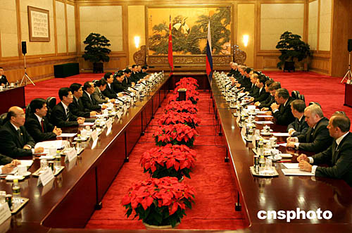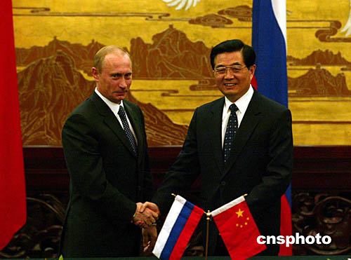 普京完全贊同胡錦濤的看法和建議,他說(shuō),發(fā)展俄中合作是俄一貫政策。《俄中睦鄰友好合作條約》為兩國(guó)關(guān)系發(fā)展奠定了重要基礎(chǔ),雙方解決邊境問(wèn)題、就俄加入世貿(mào)組織達(dá)成協(xié)議是兩國(guó)戰(zhàn)略協(xié)作伙伴關(guān)系的體現(xiàn)。我們?cè)概c中方切實(shí)落實(shí)該條約的實(shí)施綱要,推動(dòng)雙方在各領(lǐng)域的合作。俄方希望加強(qiáng)經(jīng)貿(mào)合作,爭(zhēng)取在數(shù)量和質(zhì)量上均不斷提高。他重申,俄方關(guān)于同中國(guó)的能源合作的決定始終未變,也愿同中國(guó)加強(qiáng)在科技、人文等領(lǐng)域的合作。