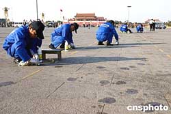 10月23日,清潔工人正在北京天安門廣場對已經發黑的花崗巖地面進行清洗。清洗工作完成后,廣場地面將恢復淡粉色原貌。清洗工作原計劃在十天內完成,但由于污漬太多,加上清理口香糖等污漬難度大,估計此次廣場大“洗臉”將會延期完成。作者:張煒