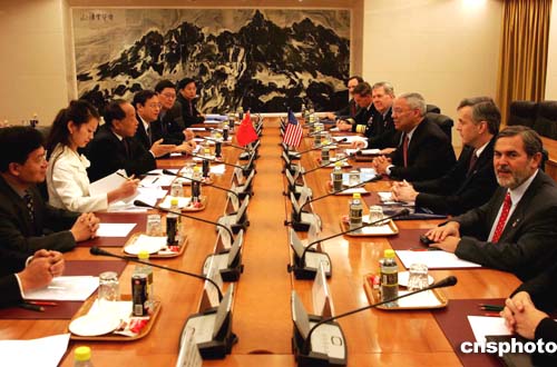 中國外長李肇星,十月二十五日在北京與來訪的美國國務卿鮑威爾會談。中新社記者:毛建軍