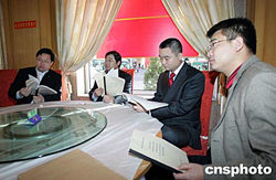 大連實德俱樂部董事長徐明(左一)、北京國安俱樂部總經理羅寧(左二)、深圳鍵力寶老總張海(右二)等準備會議材料。