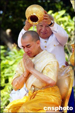 10月29日,在柬埔寨金邊王宮,柬埔寨前國王諾羅敦·西哈努克向其子、新國王諾羅敦·西哈莫尼澆圣水。
