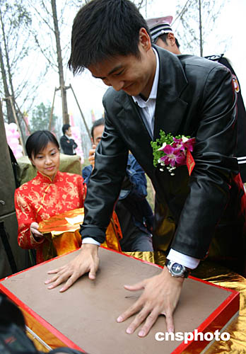 十月三十日,“跳水王子”田亮回到家鄉重慶,成為了重慶奧林匹克花園的名譽“園長”。圖為田亮在重慶奧林匹克花園留下自己的手印。作者:郭晉嘉