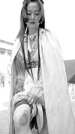 休息了一個小時后,王思懿又重新上馬繼續拍攝了,只是上下馬、走路時需要人攙扶著。而剛才還不省人事的王思懿跟沒事似的對記者做了個鬼臉,“騎馬要坐著,沒事的!倍稚先际莿偛趴呐隽粝碌膫。思懿大拇指骨節處一塊凸起引起了記者的注意,思懿指著手說,這是前不久拍舞刀戲時,用力過猛,大拇指骨折留下的痕跡,現在還沒恢復。而話音未落,王思懿更撩起褲腿,膝部被一塊碗口大小的深紫血印整個覆蓋,真是慘不忍睹,“這是在拍攝一場打戲時腿部躲閃慢了一步,刀劈到腿上的結果!彼架舱f,當時疼得要命,整個膝蓋腫得老高,比這次還嚇人。不僅如此,因為要穿鎧甲,思懿的腰上和肩上也磨出了一道道血印。不過,當被問到苦不苦時,思懿卻表示早已習慣了,“這點小傷不算什么,拍武戲哪有不受傷的,每次拍攝時都不覺得疼,只是回去洗澡時才發覺:‘唉?怎么這么疼,全都破了!