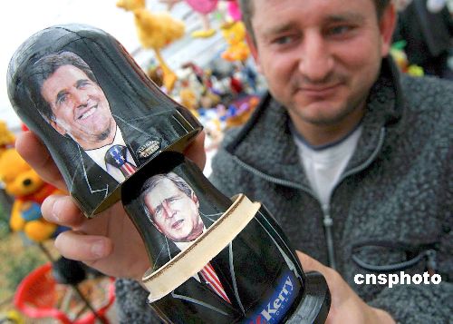 11月2日,美國總統大選開始正式投票。同日,遠在歐洲的保加利亞,印有候選人布什和克里形象的“套娃”木偶玩具上市,銷售火爆。Ic/cnsphoto 攝