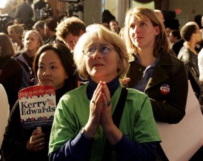 中新網(wǎng)11月3日電 據(jù)美聯(lián)社報道,美國東部時間2004年11月2日(北京時間11月3日),在賓西法尼亞州東南部城市費城舉行的美國民主黨賓州總部選舉集會上,民主黨總統(tǒng)候選人克里的支持者神情焦慮,十分緊張地盯著大廳里的計票牌。站在最前面的綠衣金發(fā)婦女雙手合十,在心中默默在為克里祈禱,希望他能夠獲得今年的總統(tǒng)大選。(固山)