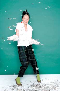 從首體主體舞臺延伸出的T型延伸臺長達8米,奶茶可以在其間自由與茶迷們親密溝通。上海演唱會上,雖然也有吊鋼絲,但由于舞臺很小,和觀眾太近,只能上下活動,效果自然不很壯觀。這次不同,舞臺前后各有支柱,奶茶的鋼絲可以上下前后移動,加上舞臺前沿還有很多鏤空,不時有風從那里吹過來,可以想象屆時的壯觀場景。