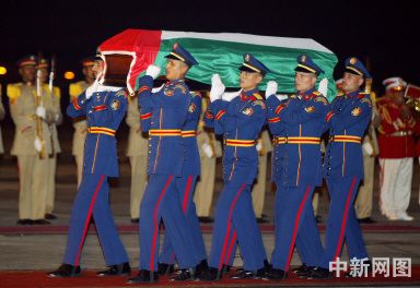 11月11日晚,巴勒斯坦領導人阿拉法特的遺體由法國航空公司一架A-319型飛機運抵埃及首都開羅機場。