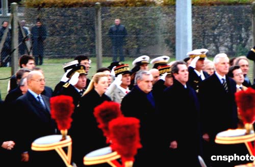 法國當地時間11月11日,在巴黎西郊的一個軍用機場,法國總理拉法藍代表法國政府參加為阿拉法特遺體送別的莊嚴儀式。