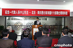 “紀念一代偉人孫中山先生--北京、南京歷史建筑圖片大展”,11月12日在臺北“國父紀念館”舉行。圖為北京中山堂管委會副主任崔順年在開幕典禮上發言。中新社記者:董會峰