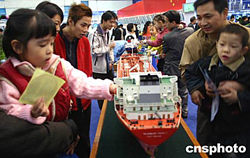 重慶高新技術交易會展出一艘四點六萬噸級的成品油輪船艦模型吸引參觀者