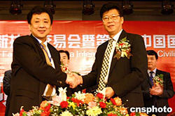 圖為重慶市副市長吳家農和中國航天科技集團公司總經理助理芮曉武簽訂合作協議。