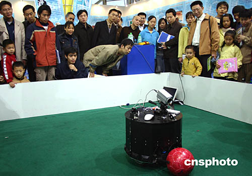 第六屆重慶高新技術交易會暨第二屆中國國際軍轉民科技博覽會十三日在重慶開幕,共展出近二千五百項科技項目。圖為“足球機器人”正在臨時圍成的球場里“踢”足球,吸引了眾多參觀者的目光。作者:郭晉嘉