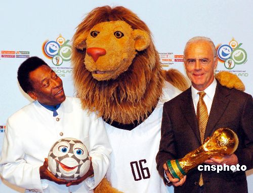 當地時間11月13日,德國2006世界杯組委會在萊比錫舉行新聞發布會,吉祥物——一頭精力充沛的“雄師”(中)與“球王”貝利(左)、德國昔日足球巨星貝肯鮑爾(右)一同亮相。Ic/cnsphoto