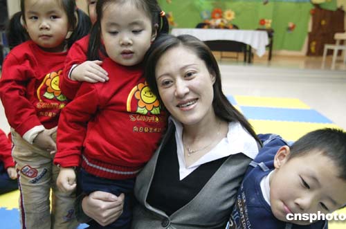 十一月十六日,北京京城特衛安全顧問有限公司的職員朱麗萍在北京的一家幼兒園與小朋友歡娛。從本月三十日起,她將成為該幼兒園的“女保鏢”并成為京城幼兒園的首位“女保鏢”。現年二十六歲的朱麗萍曾是特警,復員轉業后在北京京城特衛安全顧問有限公司供職。作者:任海霞