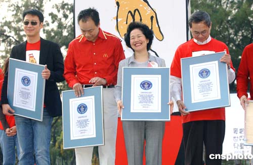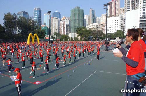 香港前政務(wù)司司長陳方安生、愛心大使黎明、麥當(dāng)勞有限公司董事總經(jīng)理劉士盛等嘉賓,在香港維園出席“麥當(dāng)勞世界兒童日2004”千人愛心跳繩,締造最多人跳繩的健力士世界紀(jì)錄。作者:洪少葵