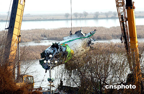 十一月二十二日下午,11.21空難事故發生第二天,從包鋼緊急調來的兩輛重型吊車正在包頭南海公園吊起失事客機的機尾部分。中新社記者:張宇