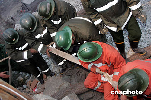 二零零四年十一月二十二日,“11.20”河北沙河礦難救援工作仍在進行。截止當日十九時三十分,河北沙河礦難遇難礦工人數已達五十七人,另有三人人下落不明。圖為消防戰士向出事礦井運送傳輸水袋,以撲滅仍在燃燒的大火。中新社記者:武仲林