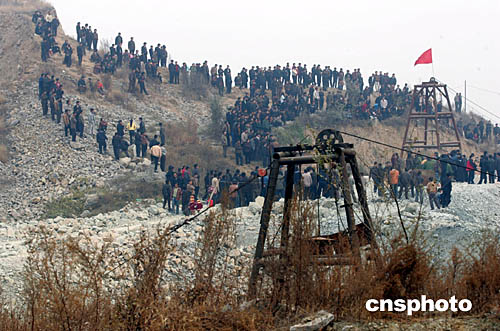 二零零四年十一月二十二日,“11.20”河北沙河礦難救援工作仍在進(jìn)行。截止當(dāng)日十九時(shí)三十分,河北沙河礦難遇難礦工人數(shù)已達(dá)五十七人,另有三人人下落不明。圖為出事礦井附近圍觀群眾。中新社記者:武仲林