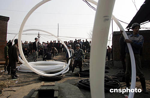 十一月二十三日,“11.20”河北省沙河礦難救援工作仍在進行,救援人員向井下運送水管以排干被水淹沒的巷道。截止當日中午,遇難礦工人數已達五十七人,另有八人下落不明。據有關方面透露,被困礦工人數仍有可能增加。中新社記者:武仲林