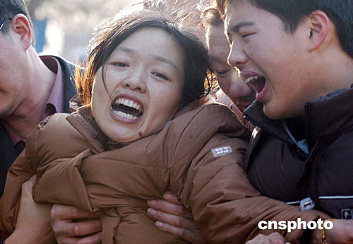 11月23日下午,11.21包頭空難遇難者家屬在飛機失事現場悲痛欲絕,被攙扶著離開。中新社記者:張宇