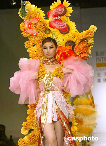 十一月二十四,北京服裝學院畢業生時裝作品分布會在北京中國大飯店舉行,一款花枝招展,彩蝶飄飄的時裝作品演繹燦爛春天。中新社記者:史利