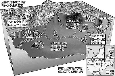 中新網11月29日電 據人民日報報道,11月28日7時左右,銅川礦務局陳家山煤礦發生特大瓦斯爆炸,截至記者當日24時發稿時,已經成功營救出127名礦工,尚有166名礦工被困井下。有關方面已派出5個救護隊,70多名救護隊員進入出事巷道,全力營救。29日凌晨1時,營救工作仍在緊張進行。