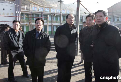 國有企業陜西銅川礦務局陳家山煤礦11月28日發生特大瓦斯爆炸事故,以國務院副秘書長尤權(右三)為組長的國務院工作組抵達后,29日上午在現場指導和協調人員進行搶救并開展事故調查工作。陜西省代省長陳德銘(右一)和國家安全監管局副局長趙鐵錘(右二)等也在現場組織搶救。作者:任晨鳴