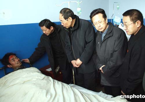 國務院副秘書長尤權(右三)、陜西省代省長陳德銘(右四)等29日上午到礦務局醫院慰問脫險礦工。作者:任晨鳴