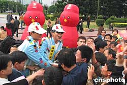 福建省衛生廳防艾工作委員會與福建省、福州市近十家有關醫療機構,聯合在福州開展大型“防治艾滋病” 宣傳活動。圖為福州市民在宣傳活動上爭領免費安全套。作者:劉可耕