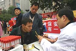 重慶市傳染病醫院的醫療人員上街免費為市民抽血檢測HIV病毒。作者:郭晉嘉