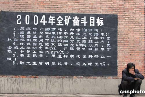 12月1日傍晚,陜西銅川礦務局陳家山煤礦被困井下礦工全部確認遇難后,一名工人無奈地蹲在礦區的“2004年全礦奮斗目標”宣傳牌前。有不少人認為,此次礦難的部分原因是礦方一味追求產量忽視安全造成的。作者:任晨鳴