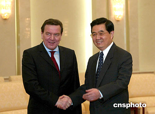 胡錦濤是今天下午在人民大會堂會見德國總理施羅德時作上述表示的。
