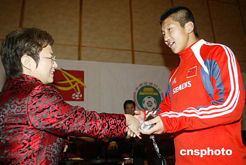 十二月七日,中國之隊主贊助商西門子有限公司在北京為即將踏上征途的“08之星足球隊”餞行,“08之星足球隊”的全體隊員以及中方教練共三十二人以及中國國家男子足球隊隊長李瑋鋒、中國足協青少部官員、西門子公司代表參加了此次活動。來自西門子公司奧運項目部部長張芳(左)在餞行儀式上向球隊的每個隊員贈送一部西門子手機,祝愿“08之星”一路順風。中新社記者:盛佳鵬