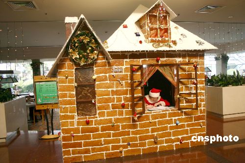“圣誕節”快來臨,杭州商家乘機大做文章,以期迎來一個好賺頭。眼下,杭州的大商場、賓館門口都放滿了圣誕樹、圣誕禮物。杭州某賓館用巧克力和糖做了一個圣誕屋招徠顧客。作者:張茵