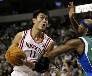 姚明身著火箭11號球衣在NBA賽場上拼搏(路透)