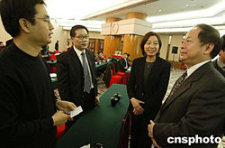 連續兩日舉辦的商務部首期服務外包培訓班學術交流氣氛濃厚,許多成員借此機會向專家學者請教咨詢。十二月十日,富士施樂(中國)有限公司副總裁李濟華(右)、北京博思商通資訊有限公司董事長曾松(左二)與商務部有關人員一起交流。中新社記者:任海霞