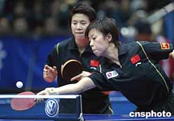 十二月十二日晚,王楠/張怡寧在北京舉行的大眾汽車2004年國際乒聯職業巡回賽總決賽女雙決賽中戰勝郭躍/牛劍鋒,奪得女雙冠軍。作者:武仲林